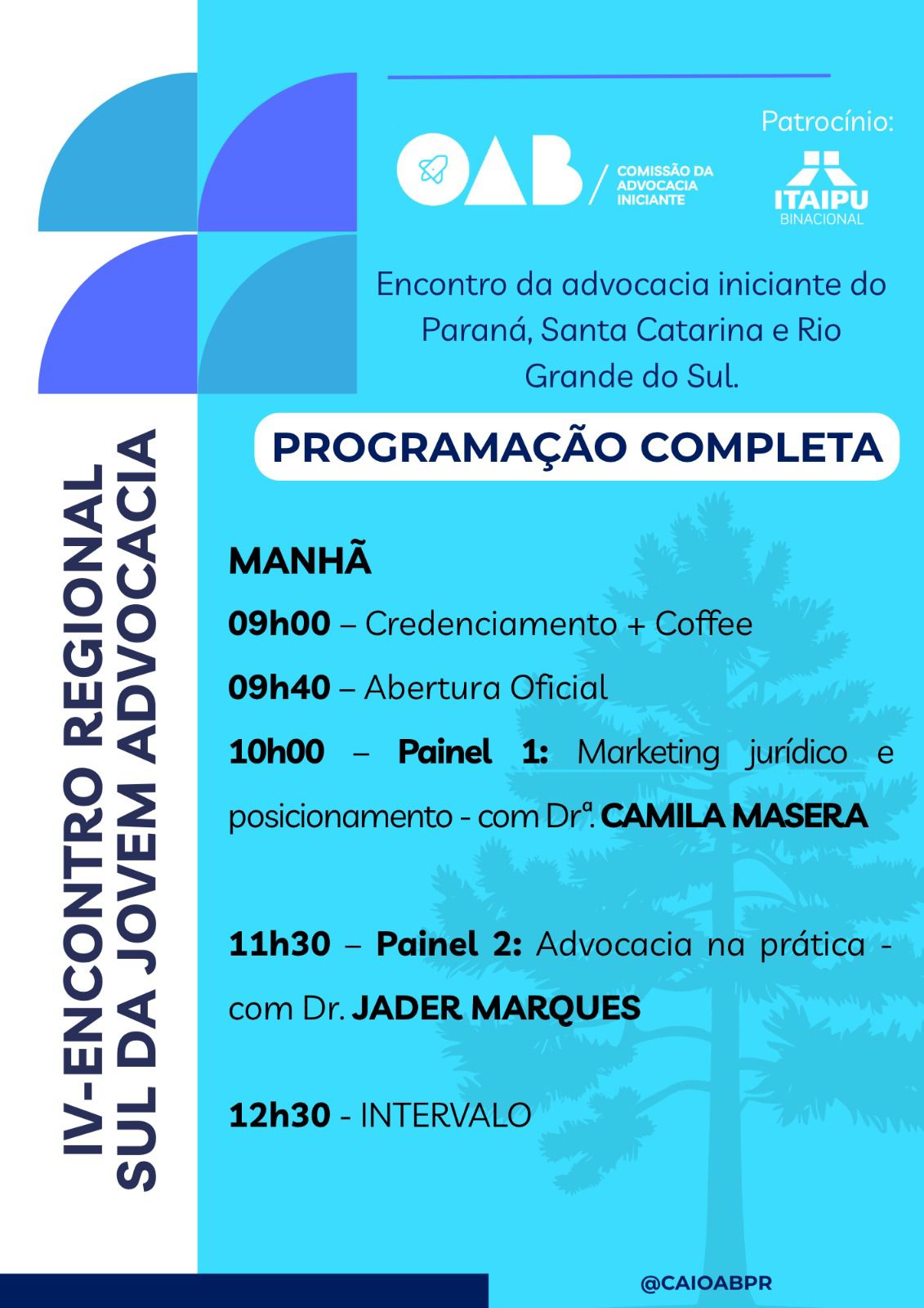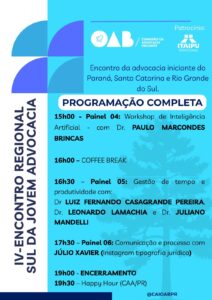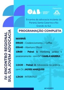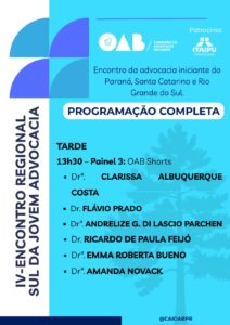 Nesse contexto, a programação do IV Encontro Regional Sul da Jovem Advocacia foi estruturada para oferecer conteúdo relevante, aplicado e alinhado às demandas contemporâneas da profissão.